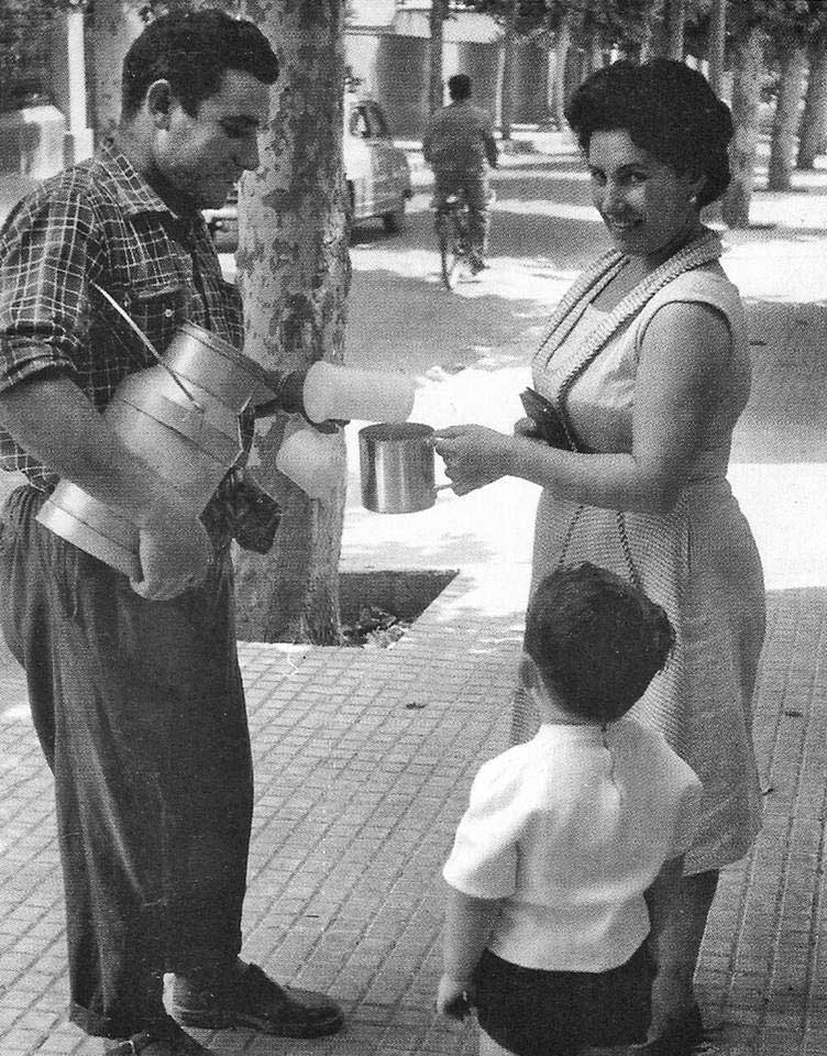 Esteve Vilardell venent llet pel carrer. Tenia la botiga a Gaietà Ventalló. La fotografia és de la dècada dels anys seixanta, i està feta a Rafel de Casanovas. La clienta és Dolors Mayolas, juntament amb el seu fill Carles Prat.