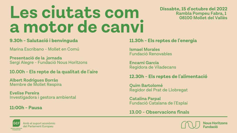 El proper dissabte 15 d’octubre es celebra a l’Institut Aiguaviva de Mollet la jornada “Les ciutats com a motor de canvi”, organitzada per la Fundació Nous Horitzons (FNH), la Fundació dels Verds Europeus (FVE) i amb suport econòmic del Parlament Europeu, en la que Mollet en Comú hi participa.