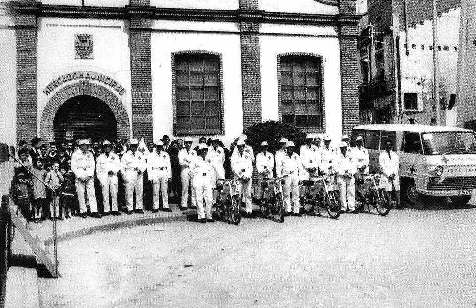 Acte de benedicció a la plaça Prat de la Riba de la nova ambulància i les quatre motos de la Creu Roja de Mollet. El 25 d’abril de 1965.