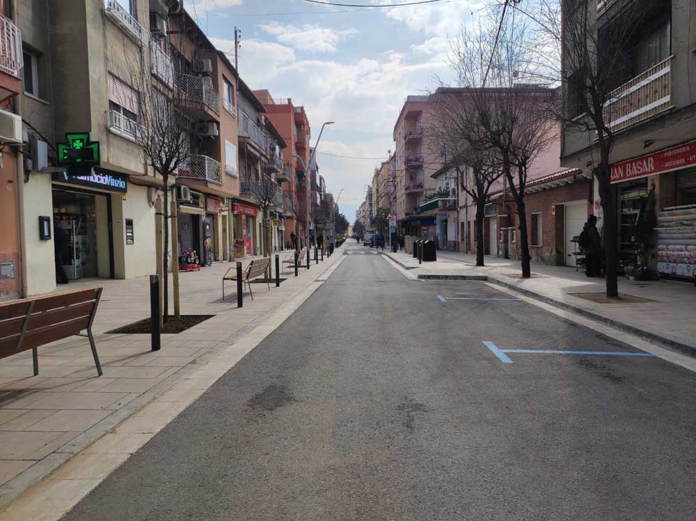 El projecte d’obres s’ha centrat en millorar la mobilitat a peu i ara aquest eix comercial uneix els barris de Can Borrell i Plana Lledó amb la zona centre. Entre les millores que s’han dut a terme, destaquen l’ampliació de les voreres, la renovació de l’asfalt i la xarxa d’aigua potable, així com la renovació del mobiliari urbà i la implantació de tecnologia LED als fanals.