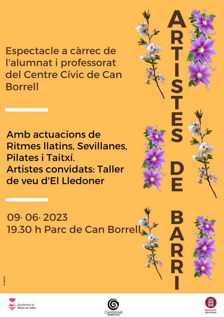 L’espectacle Artistes de Barri es fa cada any com a festa de cloenda de curs de les activitats, cursos i tallers que s’han dut a terme al llarg de l’any al Centre Cívic. Enguany hi actuaran els grups de sevillanes, ritmes llatins, pilates i taitxi, que mostraran tot el què han après durant l’any.
