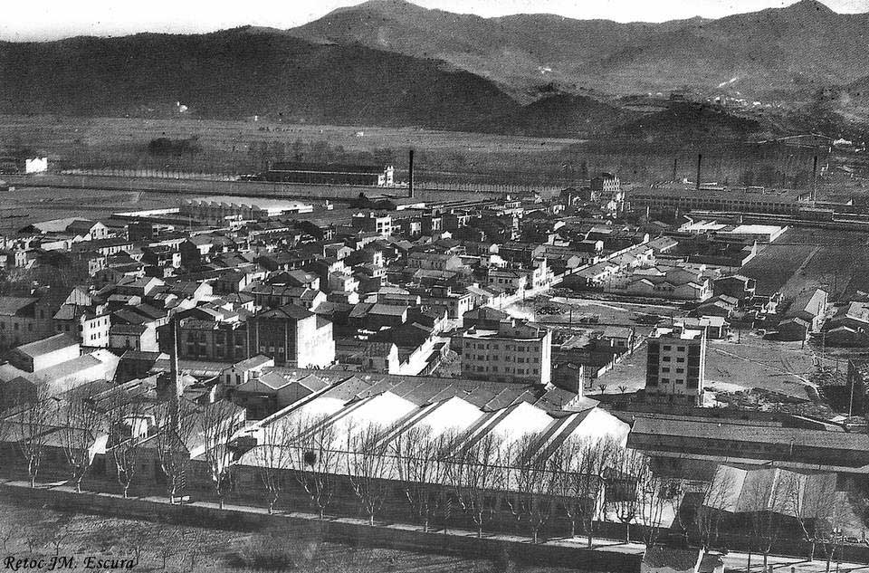 A dalt a l’esquerra can Prat, al centre Fredenhagen i a la dreta La Pelleria. Principis de la dècada dels anys seixanta.