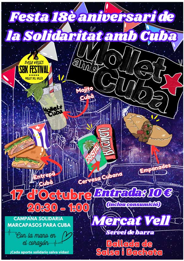 L’entitat Mollet amb Cuba celebra aquest divendres 17 d’octubre el seu 18è aniversari amb una festa solidària al Mercat Vell de Mollet del Vallès, que inclourà una ballada de salsa cubana i bachata. L’acte començarà a les 20.30 h i s’allargarà fins a la una de la matinada, amb la col·laboració del Ballavallès SBK Festival.