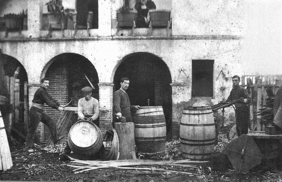 Boters de cal Medir fent botes de vi. Eren a l’Avinguda Llibertat més o menys on ara hi ha la plaça Joan Abelló.