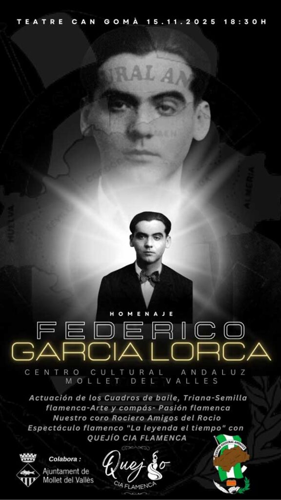 El Centre Cultural Andaluz de Mollet del Vallès organitza el seu ja memorable homenatge a l’etern poeta i dramaturg andalús Federico García Lorca. La cita tindrà lloc el proper dissabte, 15 de novembre de 2025, a les 18:30 hores al Teatre Can Gomà.
