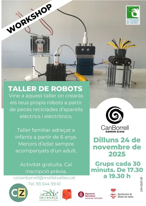 Així, el 24 de novembre, al CC Can Borrell, es durà a terme un Taller de fer robots amb peces d’aparells elèctrics i electrònics. En aquest cas cal preinscripció prèvia. Les places són limitades.