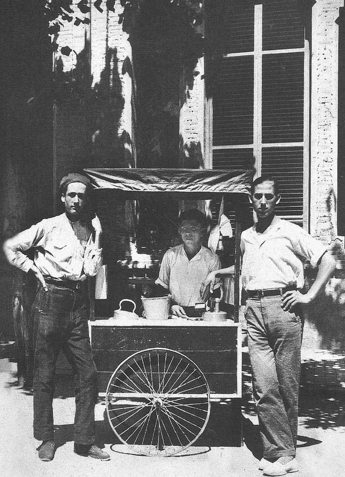 Parada ambulant de gelats davant l’edifici de l’Ateneu durant la Festa Major de 1935.