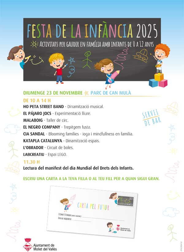 L’Ajuntament de Mollet del Vallès celebrarà el pròxim dissabte 22 de novembre la quarta Festa de la Infància al Parc de Can Mulà coincidint amb el Dia Internacional de la Infància que se celebra aquella setmana, concretament el dijous 20 de novembre. Una festa on el protagonisme, un any més, serà per als nens i les nenes de 0 a 12 anys i les seves famílies, i que constarà de tallers educatius, espais de jocs o espectacles infantils de música i dansa, entre altres activitats.